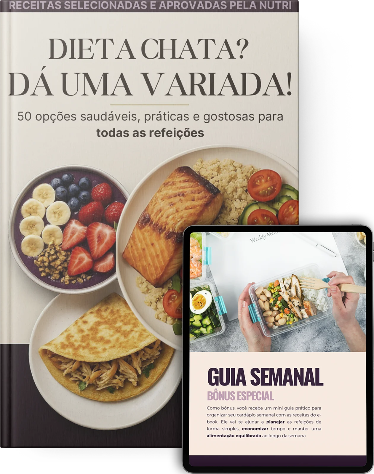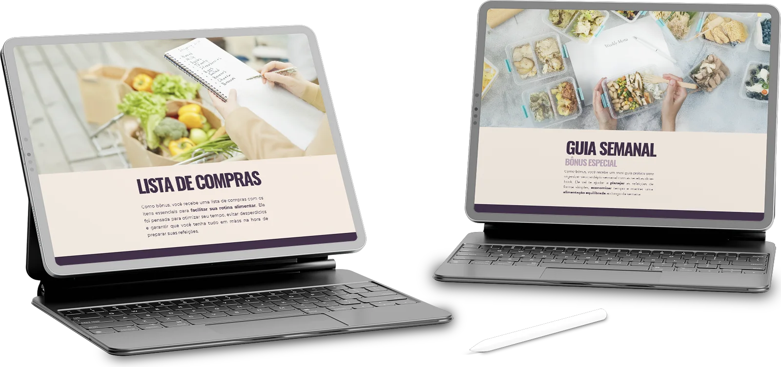 Como bônus, você recebe um guia semanal com opções de refeições do ebook para a semana e uma lista de compras com os itens essenciais para facilitar sua rotina alimentar e organizar seu cardápio semanal.