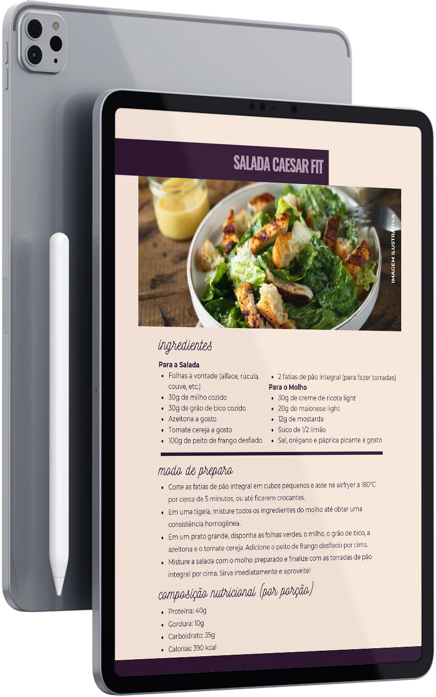 Eu sei que já aconteceu! Por isso, criei este e-book de receitas como um guia prático, recheado das melhores preparações que já aprovei, para te ajudar a tornar sua alimentação mais gostosa, fácil e, claro, sem abrir mão dos seus resultados.