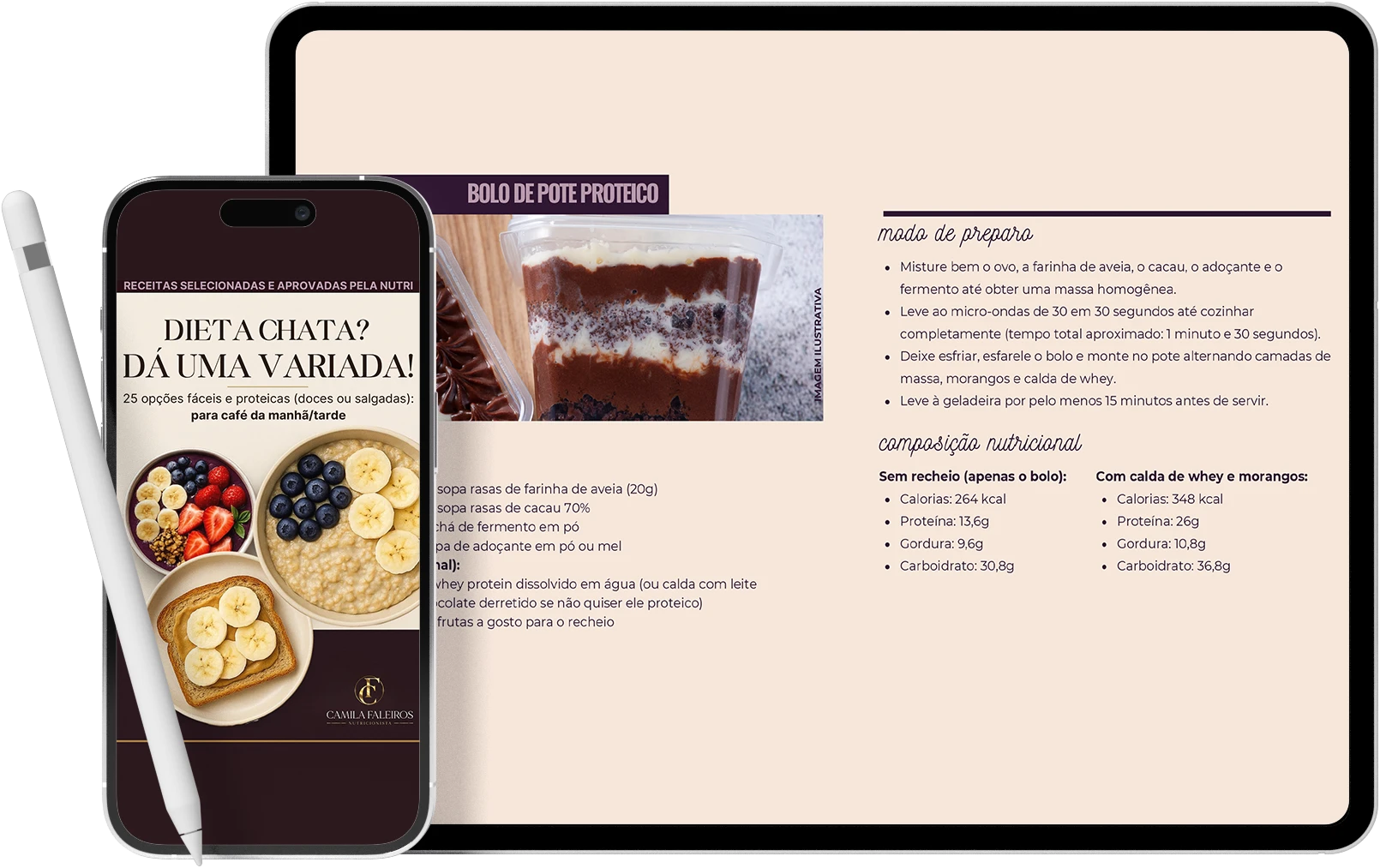 Nos seus E-books, ela compartilha receitas acessíveis e criativas que se encaixam no dia a dia — de cafés da manhã rápidos à jantares completos — além de cardápios organizados e bônus que ajudam na constância.